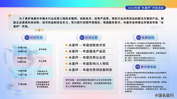 · 獎項設置全面:涵蓋年度創新技術獎、年度最佳產品獎、年度優秀企業獎、年度影響力人物獎、年度優秀項目案例獎五大獎項,從技術、產品、企業、人物到項目,全維度覆蓋污水處理領域的創新成果。無論是能顯著降低污泥含水率的脫水技術,還是實現智能化運營的處理系統,只要經實踐檢驗能為行業降本增效,均可參與,接受由院士、資深工程師及企業技術負責人組成的權威評審團的專業評定。